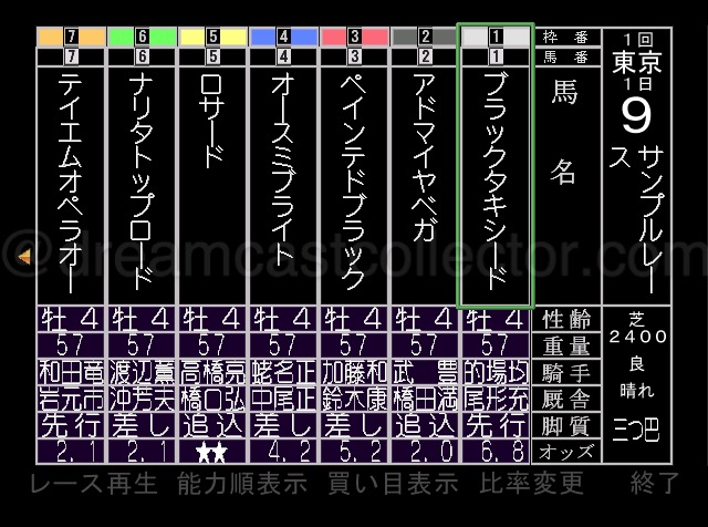 It It seems that Shangri-La found something of a niche market with equestrian software that they successfully managed to exploit to their advantage. Arguably, they experienced the majority of their success with domestic computer instalments but they did release iterations of this genre on both the Sony PlayStation & Dreamcast. The issue that I have is I have no knowledge or indeed any sort, of interest in horse racing in general. This extends to the various terminology or procedures of actually betting on horses. Given that Shangri-La’s Dreamcast title is a horse racing analysis & prediction utility software puts me at a disadvantage regarding judging how accurate its content is.